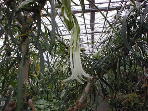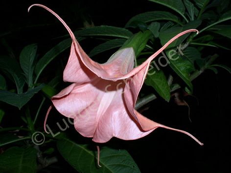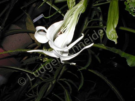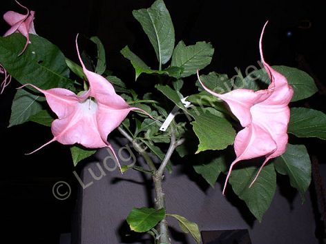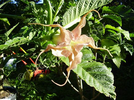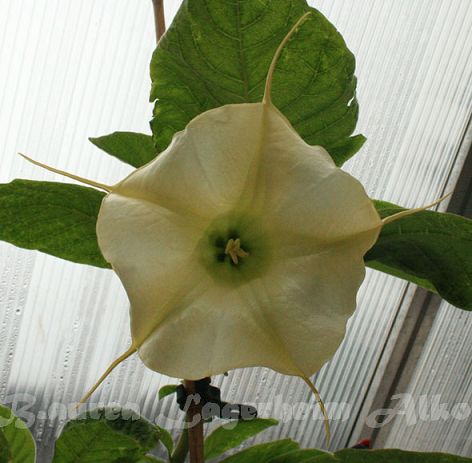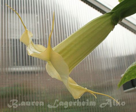 Die B.aurea stammt aus den Andenregionen in Kolumbien,Venezuela und Ecuador. B.aurea ist sehr starkwüchsig und hat die größten Blätter aller Brugs. Sie ist eine sehr robuste Brugmansia und ihre Blüten erscheinen auch in kühlen regenreichen Sommern. B.aurea hat nickende bis fast waagerecht stehende Blüten mit sehr langen Blütensaumspitzen. Zwischen 22 und 35 cm mißt man die Blütenlänge. Die Farben sind häufig weiß, gelb bis orangegelb. Seltener sind auch rosa Aurea anzutreffen. Der Kelch ist meistens 5-fach geschlitzt und der verengte Teil der Kronröhre wird vom Kelch vollständig bedeckt. B.aurea hat eiförmige Früchte mit sehr großen Samen die von einer dicken Korkartigen Schicht umhüllt sind.