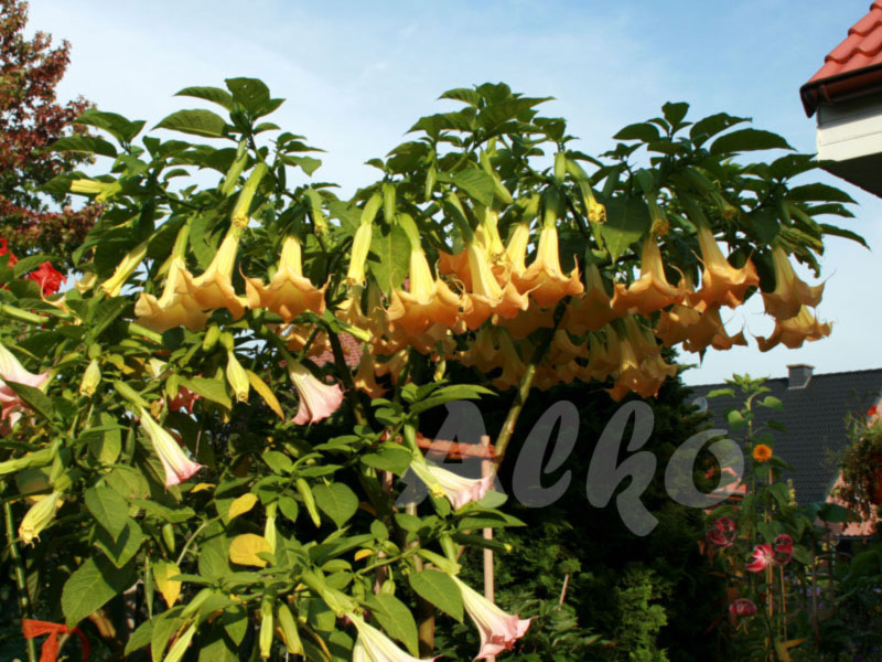Die B.x candida kommt in freier Natur an den Andenhängen in Ecuador zwischen 1000 und 1500 m Höhe vor. Es ist eine Naturhybride aus B.aurea x B.versicolor. Sie hat hängende Blüten mit teilweise sehr langen Saumzipfeln. Die Eigenschaft auch bei nicht optimalen Bedingungen gutes Blühverhalten zu zeigen, sichert ihr den Ruf neben der B.suaveolens zu den blühsichersten und blühstärksten Brugmansien zu gehören. Ein weiterer nicht unerheblicher Punkt ist, daß nur aus dieser Kreuzung gefüllte oder etagierte Blüten hervorgehen können.